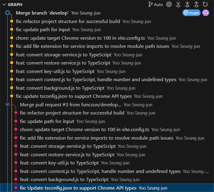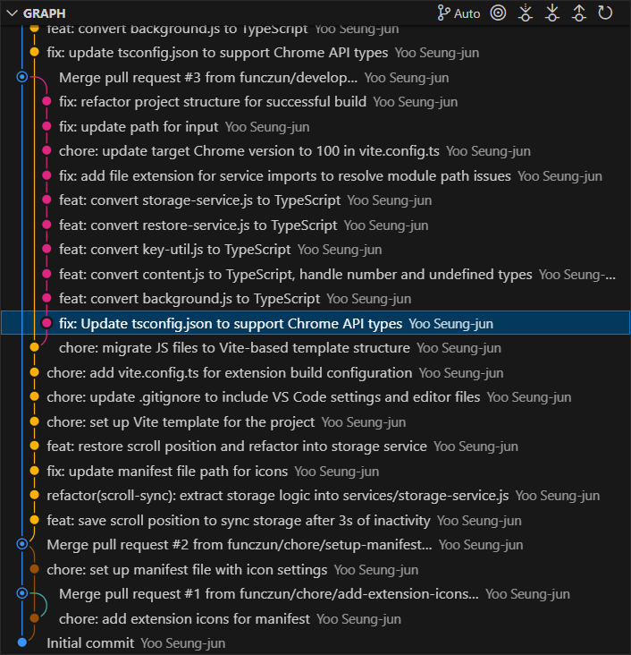 나는 분명 첫 글에서 예고했던 것처럼, develop 브랜치를 분기해 feature/scroll-sync, feature/vite-setup으로 기능별 브랜치를 따 작업했다. (언제든 기능별 브랜치 히스토리를 추적하고 싶었다.)