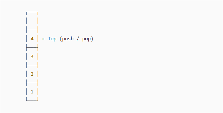 데이터를 차곡차곡 쌓는다는 의미인 스택은 top을 통해서만 접근이 가능하기 때문에 push와 pop 모두 top에서 이루어진다. 마지막에 추가된 데이터가 가장 먼저 제거되는 후입선출(後入先出) 구조를 따른다. 물론 프로그래밍 언어와 구현에 따라 서로 다른 자료형을 혼합하는 경우도 있을 수 있지만, 일반적으로는 동일한 자료형으로 구성된다. 그래야 안정성이 보장되기 때문이다.