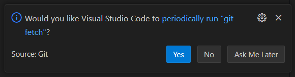 When you commit, you might eventually see a popup like the one below. Here, "git fetch" refers to the Git command that retrieves changes from the remote repository to your local repository. It is used to check the latest state of the remote. It's also important to note that git fetch does not automatically merge, so you'll need additional commands to update your local branch.