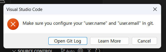 When committing for the first time through VS Code, you might see a popup like the one below, even if you have logged into your GitHub account. This popup appears because your Git configuration does not have a registered user name and email.