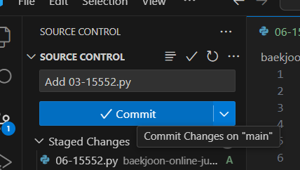After opening VS Code, you can either click on the Source Control icon or use the shortcut "Ctrl+Shift+G" to navigate to source control. Enter an appropriate commit message, and then click the commit button.
