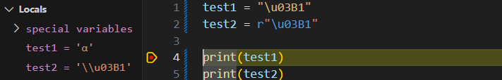 When the str is assigned to the variable test1, 'α' is assigned, while in the case of assigning a raw str to the variable test2, '\u03B1' is assigned. For reference, a raw str is indicated by placing an 'r' before the str.