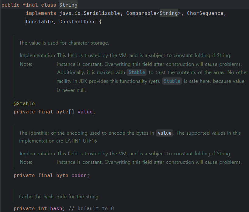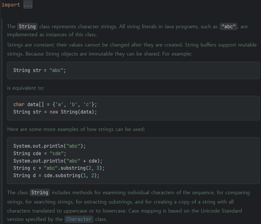 일단 문자열 리터럴이라 함은 큰따옴표로 묶인 문자의 연속체이다. 자바에서는 이러한 문자열 리터럴에 대해 최적화 기능을 제공하는데, 이를테면 동일한 리터럴에 대해 동일한 객체를 참조하도록 한다.