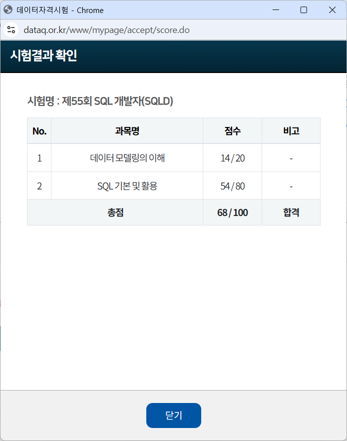 SQLD는 총점 60점 이상 시 합격하는 시험입니다. 단, 과목별 40% 미만 시 과락 처리하기 때문에, 1과목에서 6문항, 2과목에서 24문항 이상 맞히면 됩니다. 중요한 건, 50문항 중 20개를 틀려도 합격입니다. SQLD 준비하시면서 분명히 이해하기 어려운 파트가 나올 텐데요. 그냥 버리세요. 헷갈린다 싶은 거 전부 다 버리셔도 20개 안 됩니다.
