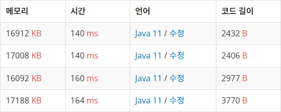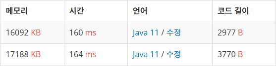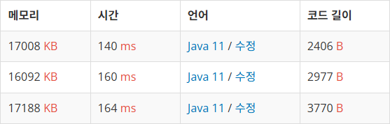 다행히 정답 처리는 되었습니다만, 딱 봐도 문제가 많죠. 제가 보기에 중복된 코드들은 물론이고 메모리 낭비까지 있는 것 같습니다. 답은 맞혔으니 이제 리팩토링 해보기로 결심했습니다.
