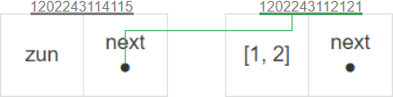 왼쪽 노드의 메모리 주소가 "1202243114115"이고 오른쪽 노드의 메모리 주소가 "1202243112121"이라고 가정하자. "zun"이라는 데이터를 지닌 왼쪽 노드의 포인터가 오른쪽 노드의 메모리 주소인 "1202243112121"를 저장한다면 어떨까? 두 노드가 링크를 통해 하나의 연결리스트가 된다.